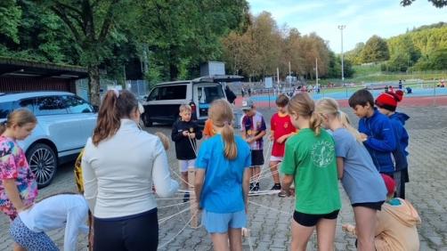 In der Sportanlage angekommen, wird nach einem kurzen Einwärmen, das von motivierender Musik begleitet wird, direkt losgelegt. Neben den klassischen Leichtathletikposten wie Weitsprung, 60m Lauf und Ballweitwurf können sich die Athleten und Athletinnen bei Spassspielen oder Pendelstafetten vergnügen und auspowern.